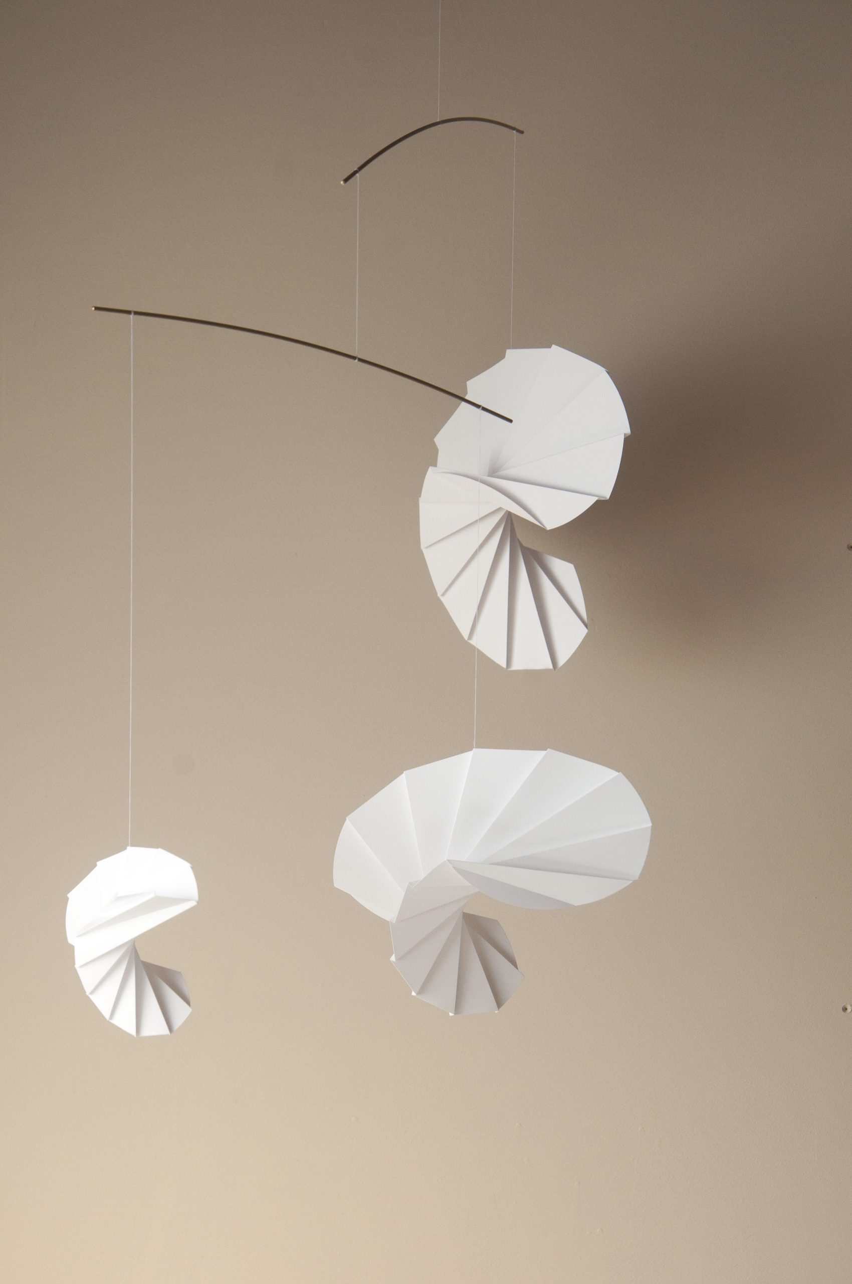 O mobile Wave 3, inspirado nas ondas, no mar e nas formas marítimas é dobrado à mão em folha serigráfica (plástico branco) suspensa em barras de aço inoxidável banhadas a ouro.